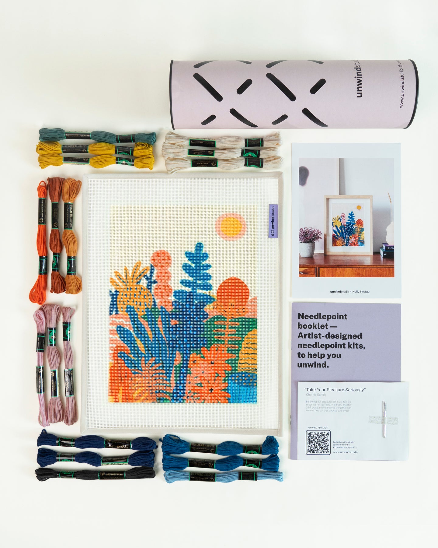 When you buy the “Printed canvas only” option, all the above is included except the threads, and just a single needle. It’s the perfect option if you want to create your own color variation, or re-use threads and yarn you might have at home!