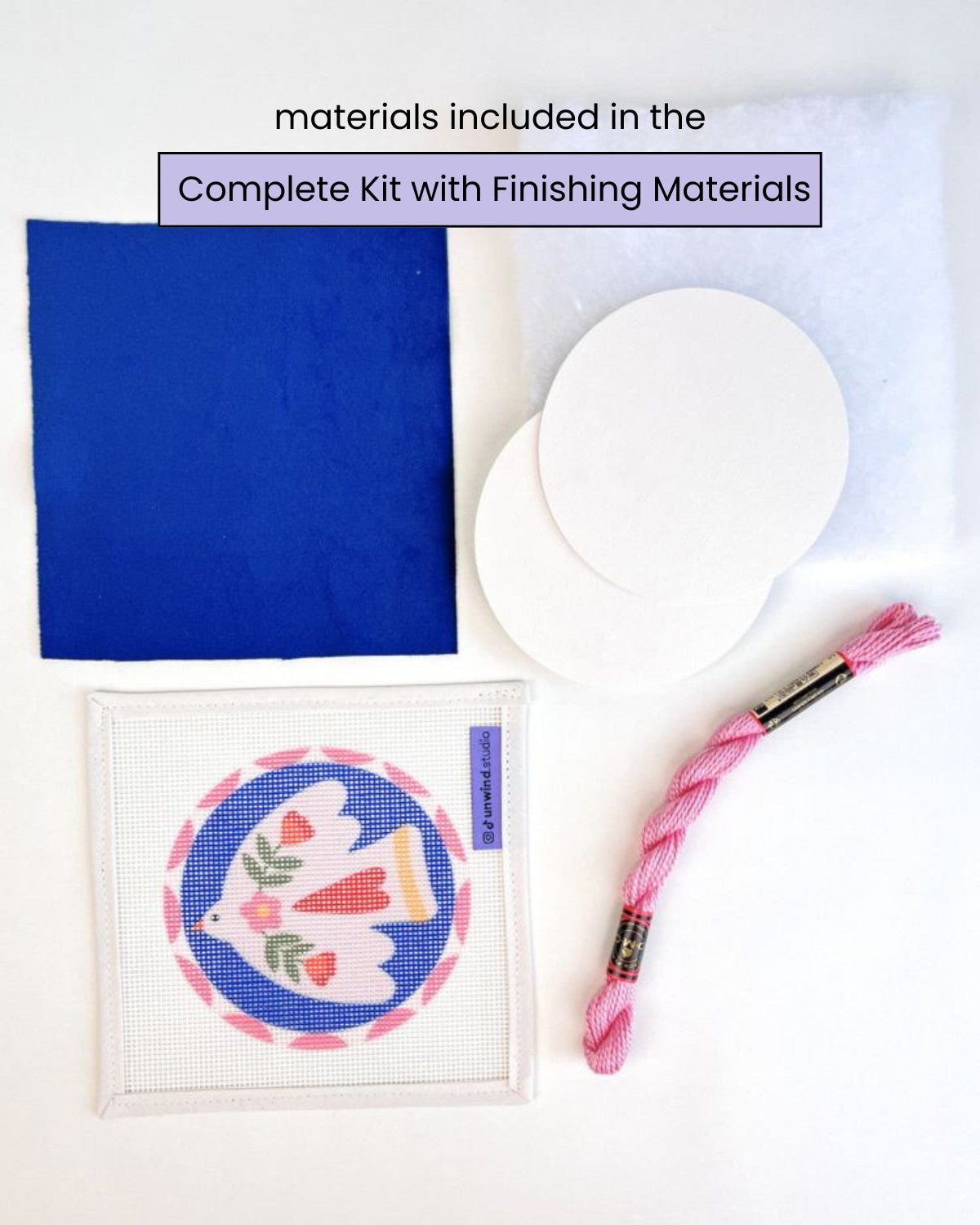 Lorsque vous achetez l'option « Toile imprimée uniquement », tout ce qui précède est inclus, à l'exception des fils et d'une seule aiguille. C'est l'option parfaite si vous souhaitez créer votre propre variation de couleur ou réutiliser des fils et du fil que vous pourriez avoir à la maison !