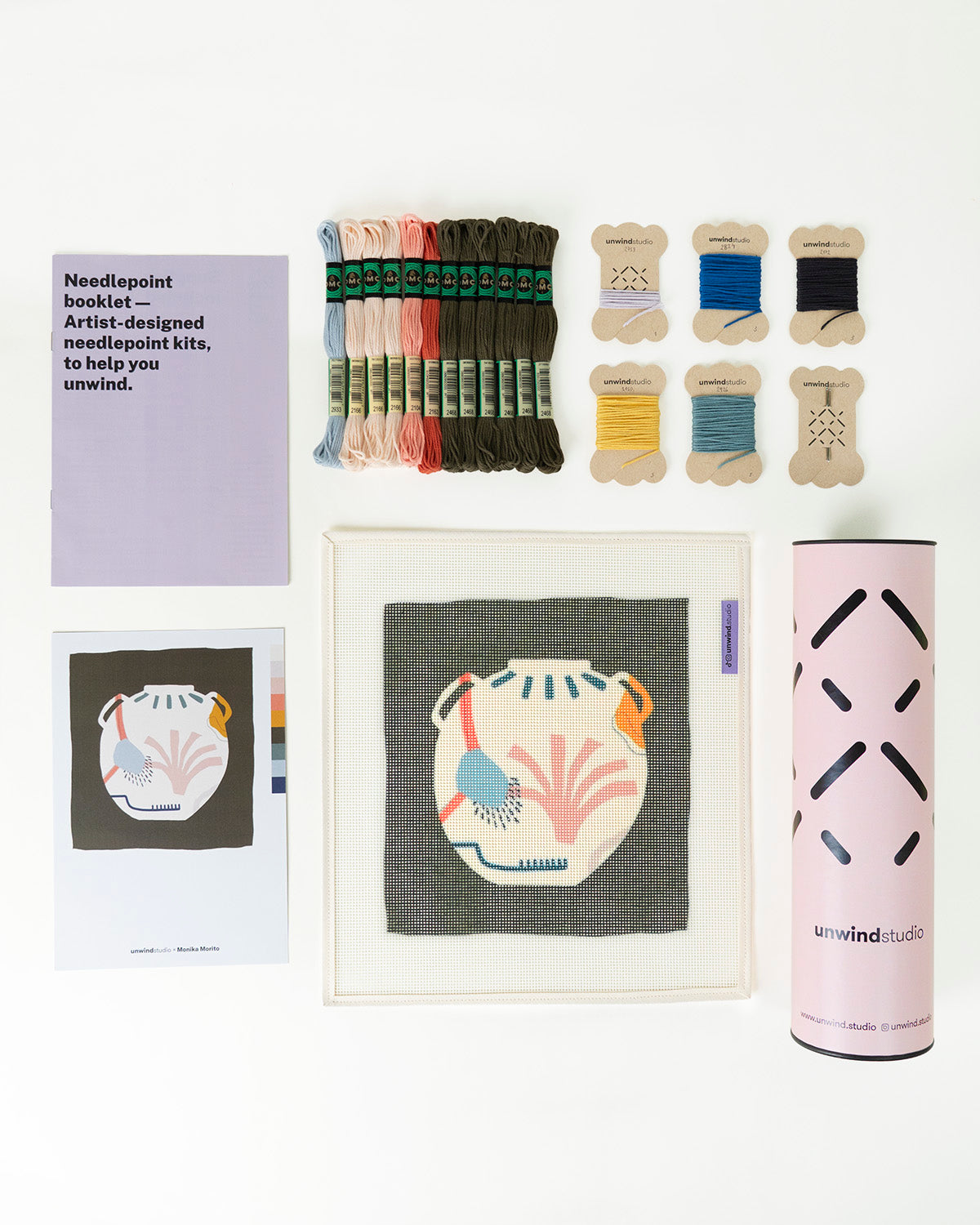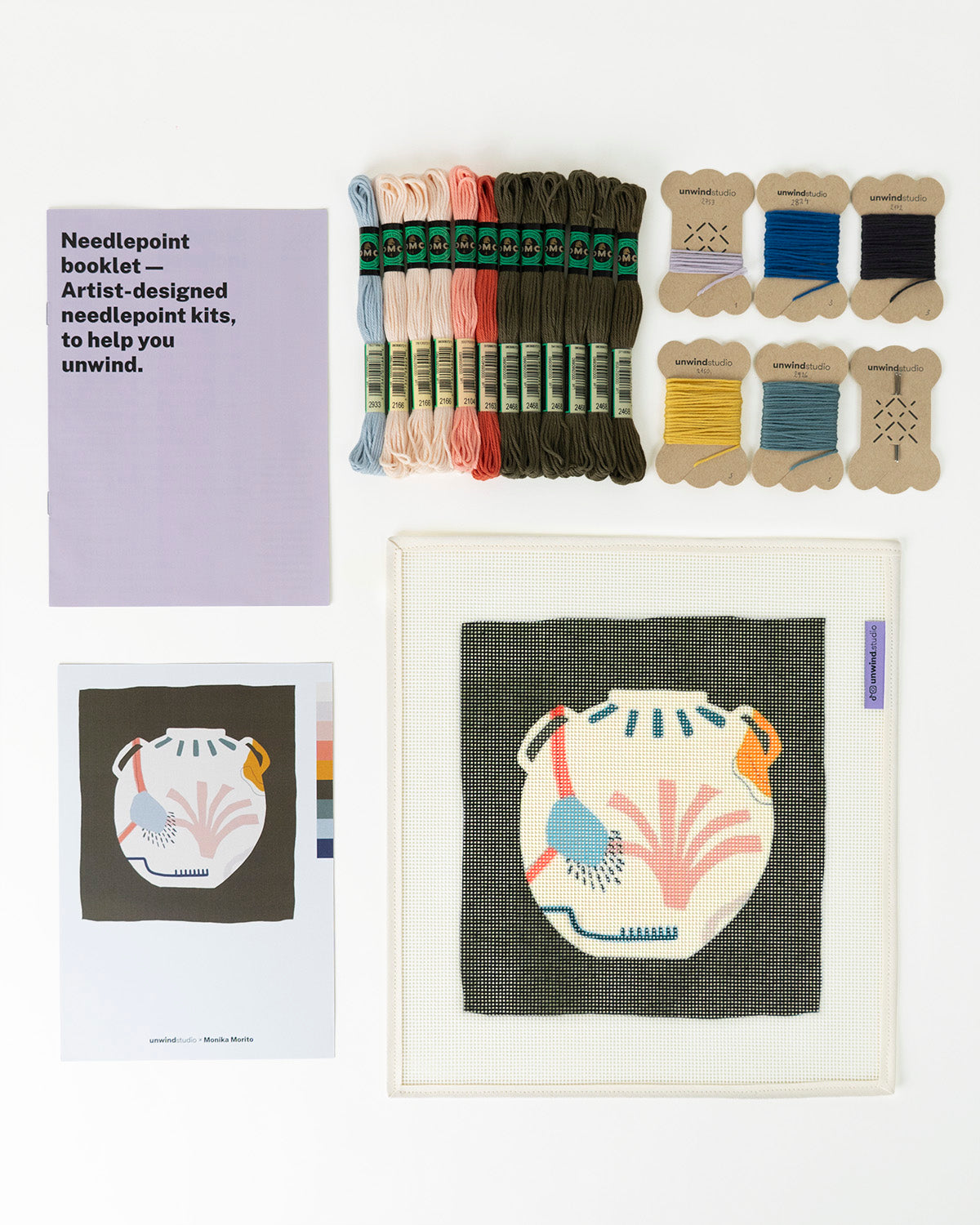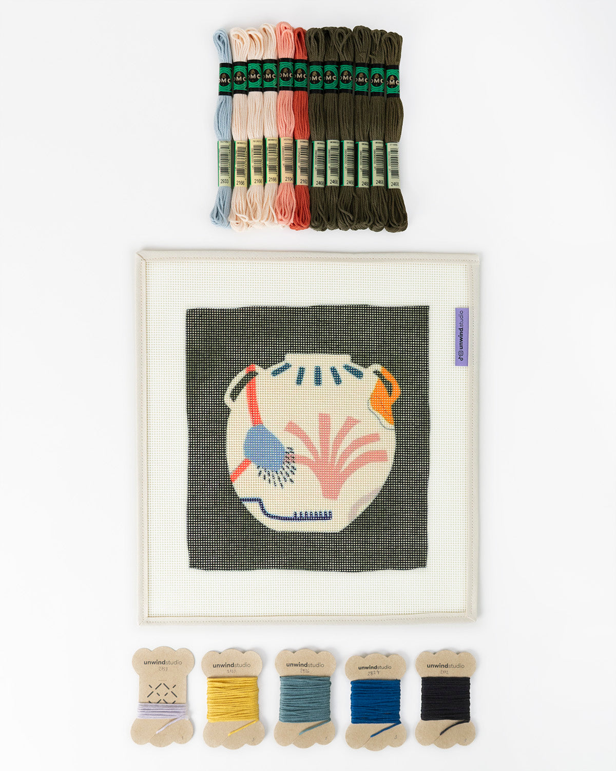 Lorsque vous achetez l'option « Toile imprimée uniquement », tout ce qui précède est inclus, à l'exception des fils et d'une seule aiguille. C'est l'option parfaite si vous souhaitez créer votre propre variation de couleur ou réutiliser des fils et du fil que vous pourriez avoir à la maison !