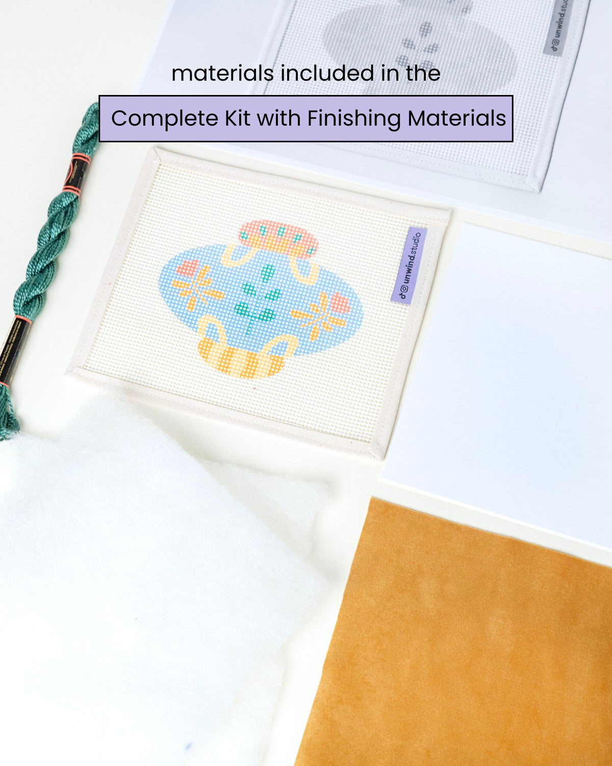 Lorsque vous achetez l'option « Toile imprimée uniquement », tout ce qui précède est inclus, à l'exception des fils et d'une seule aiguille. C'est l'option parfaite si vous souhaitez créer votre propre variation de couleur ou réutiliser des fils et du fil que vous pourriez avoir à la maison !