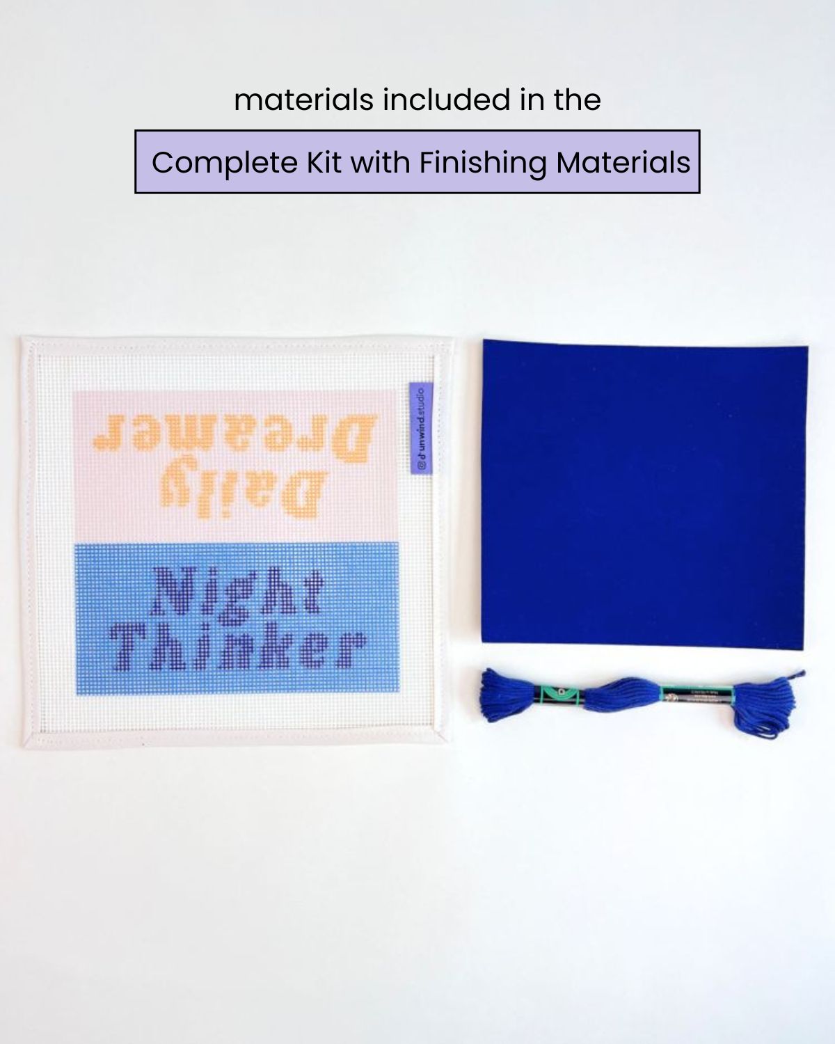 Lorsque vous achetez l'option « Toile imprimée uniquement », tout ce qui précède est inclus, à l'exception des fils et d'une seule aiguille. C'est l'option parfaite si vous souhaitez créer votre propre variation de couleur ou réutiliser des fils et du fil que vous pourriez avoir à la maison !