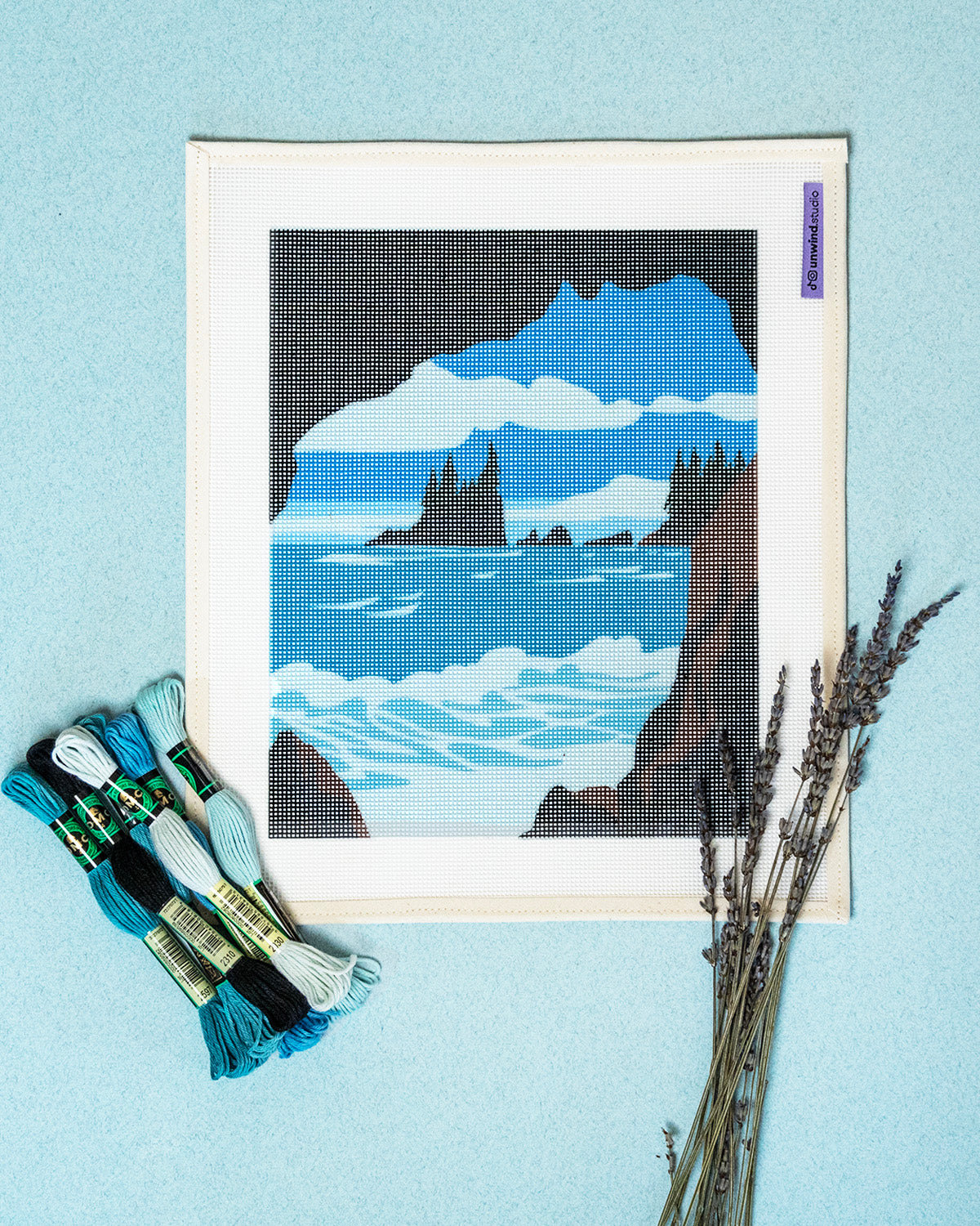 Needlepoint kit with a mountain and ocean design on a light blue background