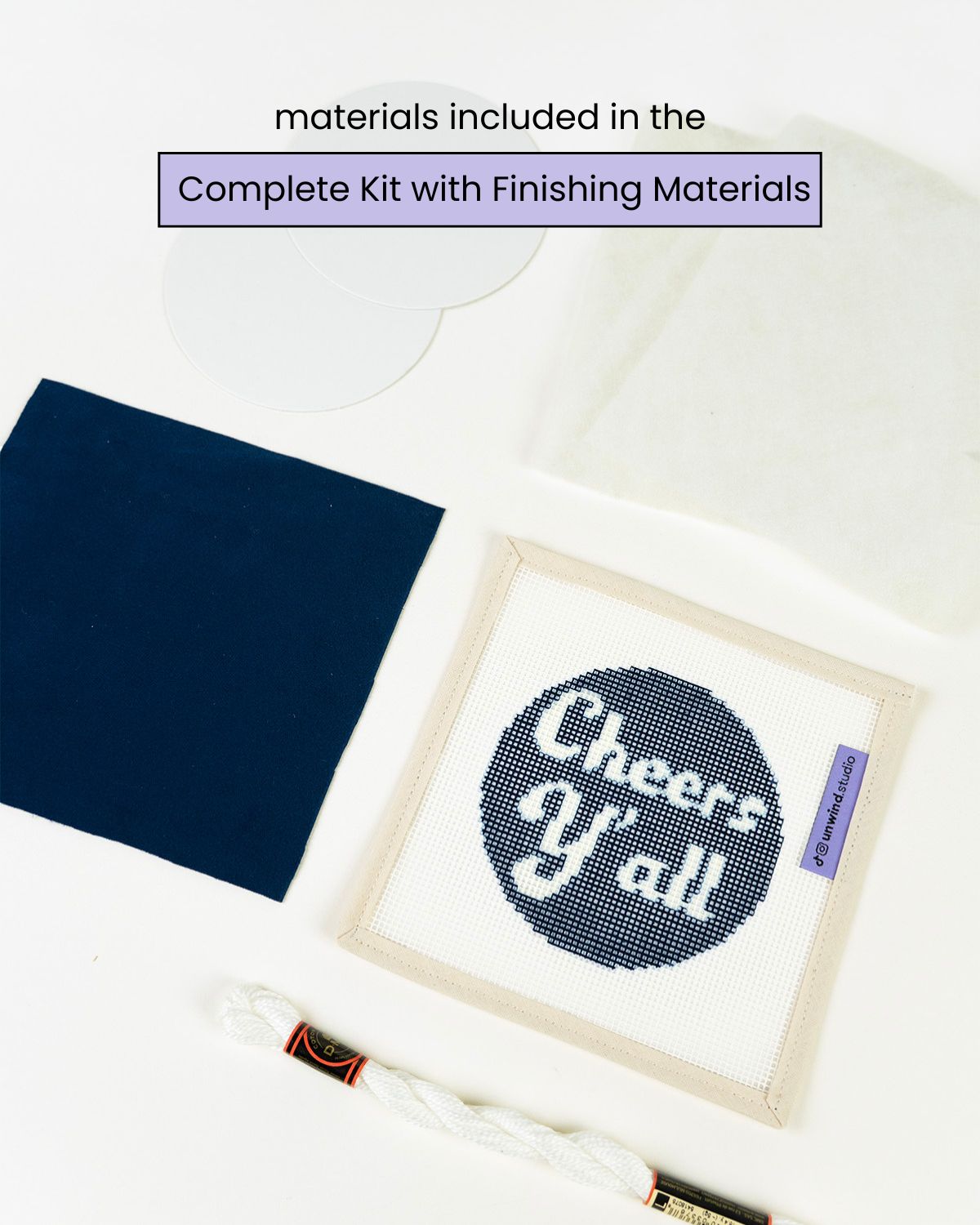 Lorsque vous achetez l'option « Toile imprimée uniquement », tout ce qui précède est inclus, à l'exception des fils et d'une seule aiguille. C'est l'option parfaite si vous souhaitez créer votre propre variation de couleur ou réutiliser des fils et du fil que vous pourriez avoir à la maison !