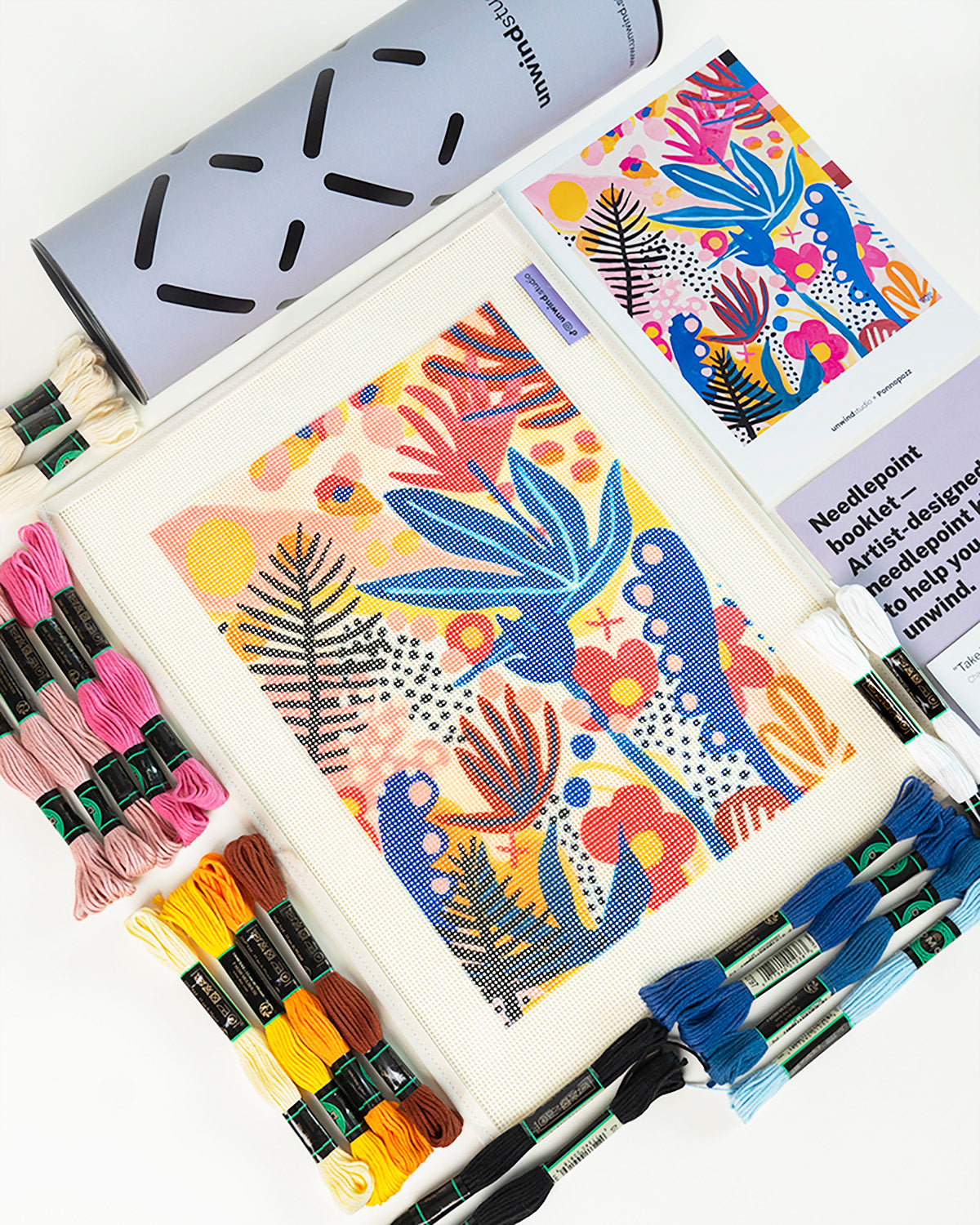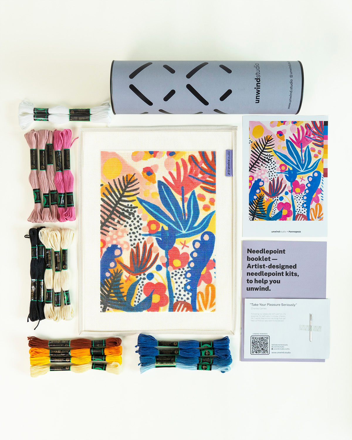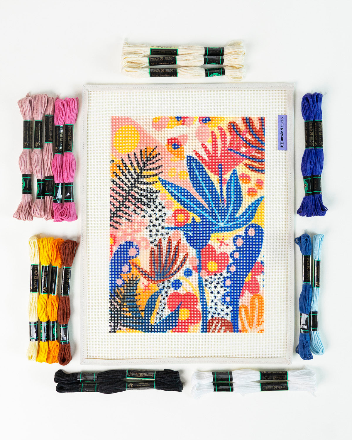 Lorsque vous achetez l'option « Toile imprimée uniquement », tout ce qui précède est inclus, à l'exception des fils et d'une seule aiguille. C'est l'option parfaite si vous souhaitez créer votre propre variation de couleur ou réutiliser des fils et du fil que vous pourriez avoir à la maison !