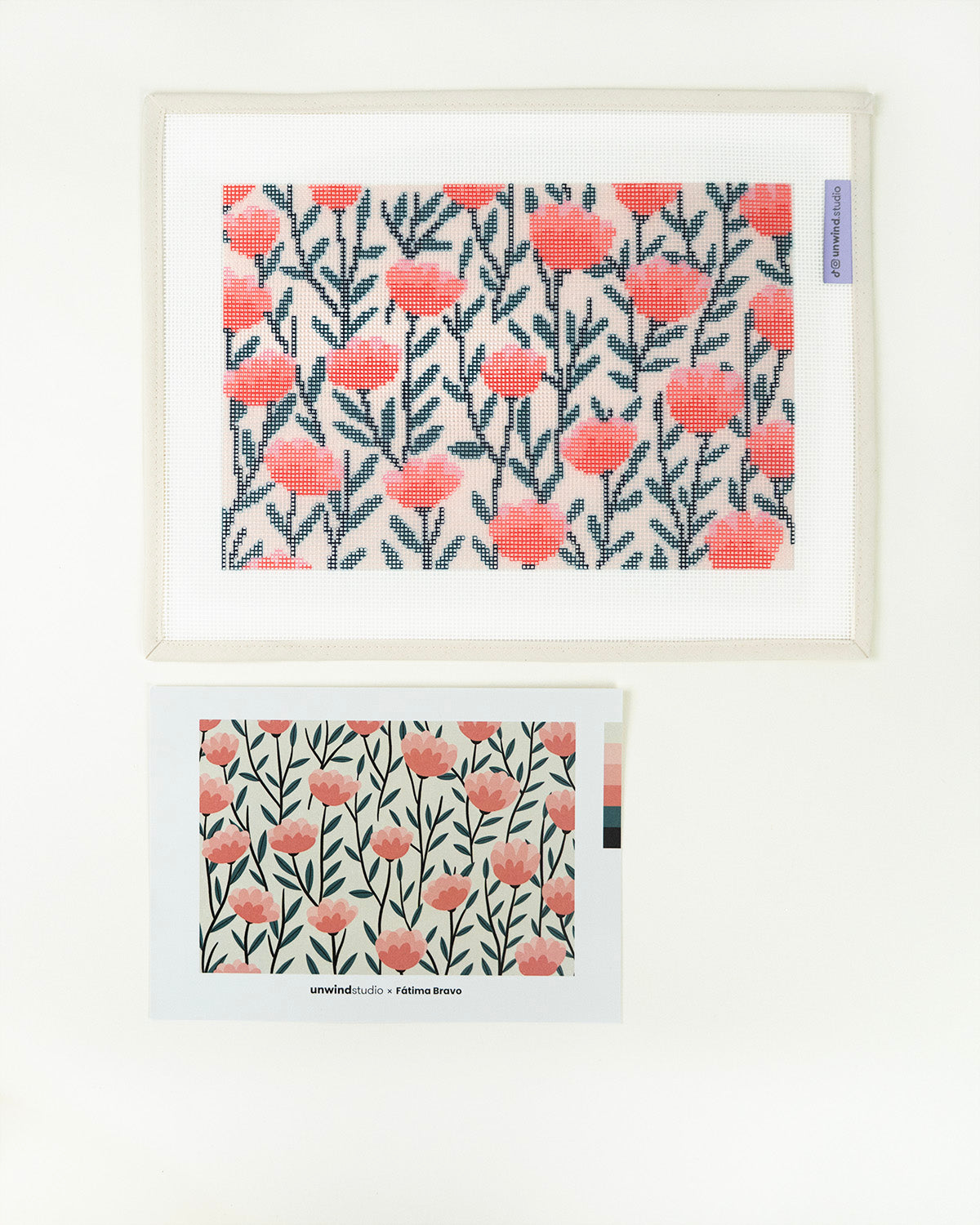 When you buy the “Printed canvas only” option, all the above is included except the threads, and just a single needle. It’s the perfect option if you want to create your own color variation, or re-use threads and yarn you might have at home!