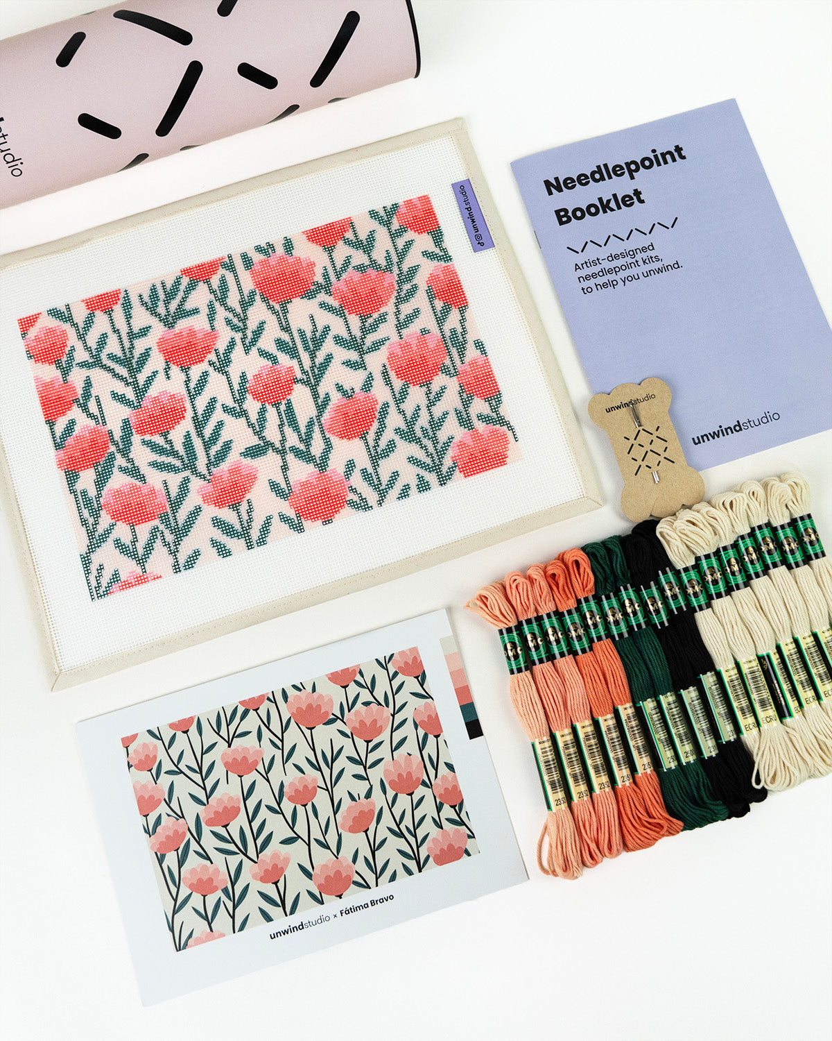 - Threads with enough quantity to stitch with the continental tent stitch (more information in the Product FAQ's; if you need more thread, leave a note at checkout - we offer you all the thread needed without extra cost!)