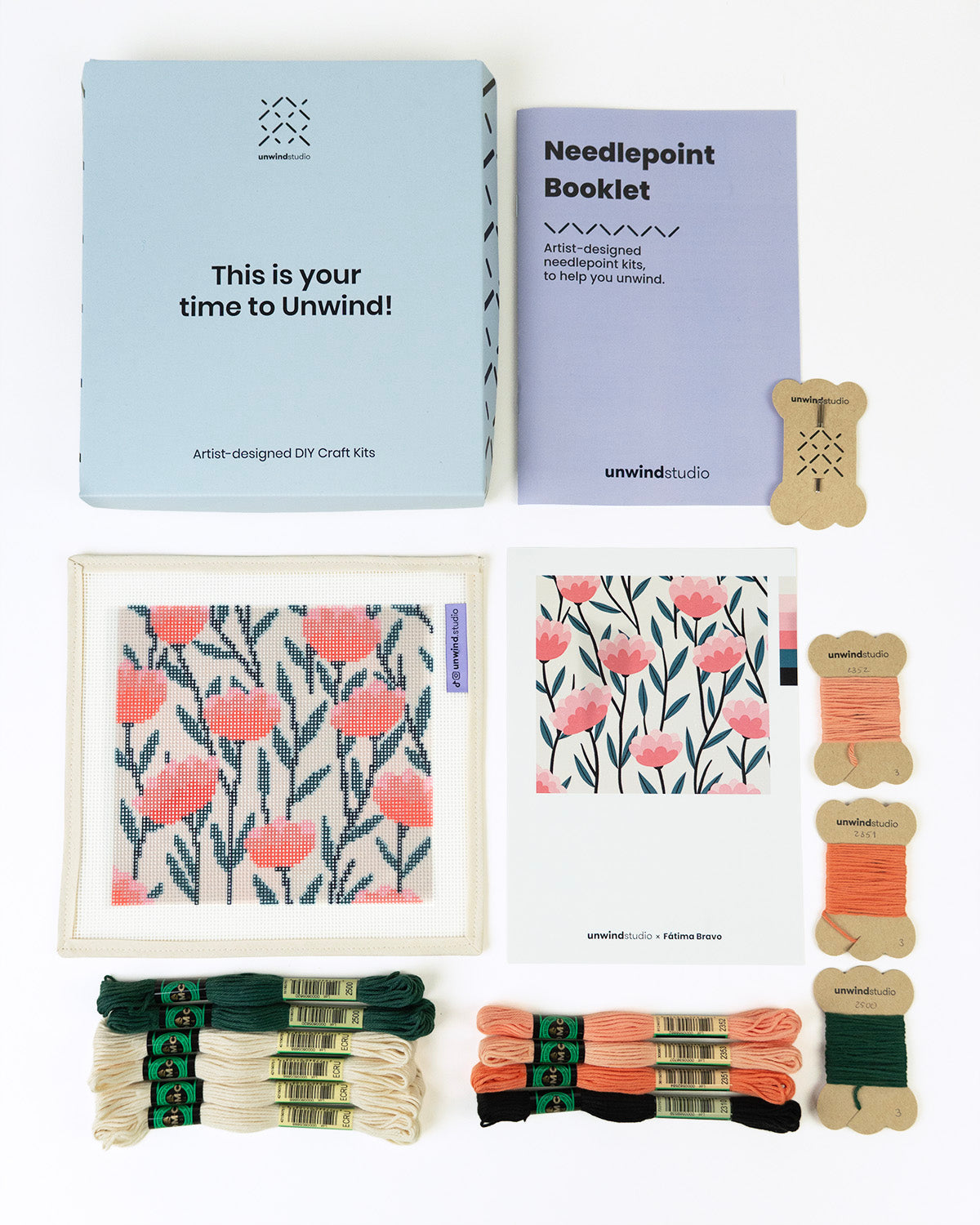 - Threads with enough quantity to stitch with the continental tent stitch (more information in the Product FAQ's; if you need more thread, leave a note at checkout - we offer you all the thread needed without extra cost!)