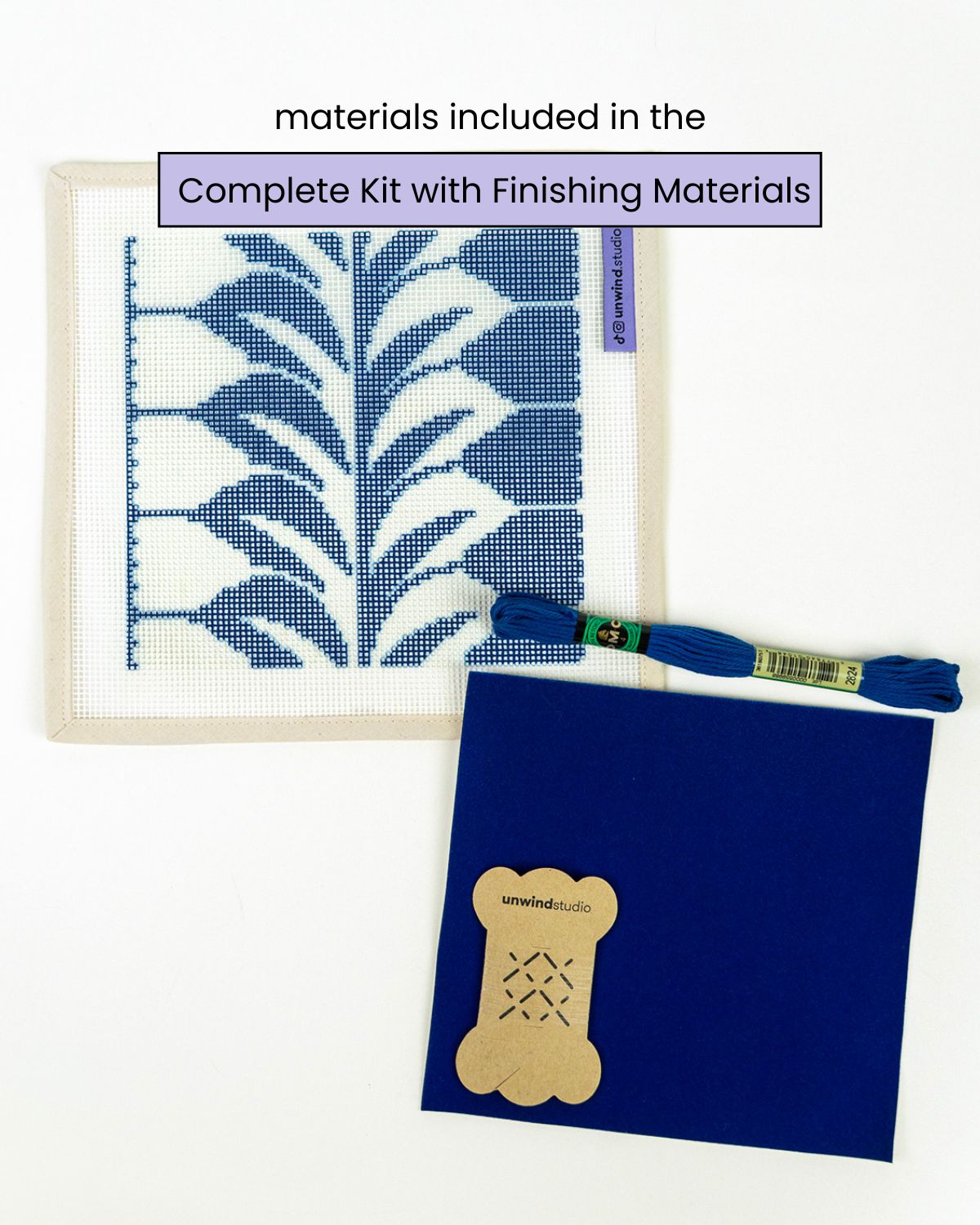 When you buy the “Printed canvas only” option, all the above is included except the threads, and just a single needle. It’s the perfect option if you want to create your own color variation, or re-use threads and yarn you might have at home!