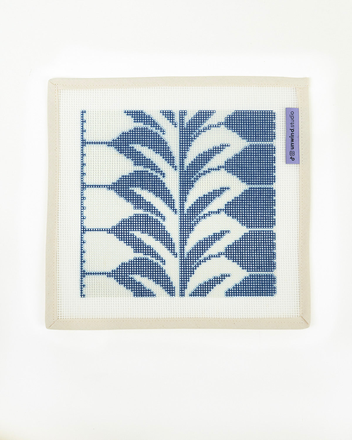 Reflect the tranquility of a breezy summer day with the Blue Mirror Sunglasses Case by Cecilia Pettersson. This needlepoint kit features a cool abstract design in calming blue and white tones, capturing the essence of a relaxing summer.