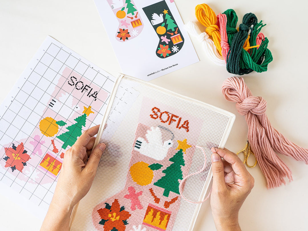 Mini Christmas Stocking Needlepoint Kit - Folk Pattern by Unwind Studio