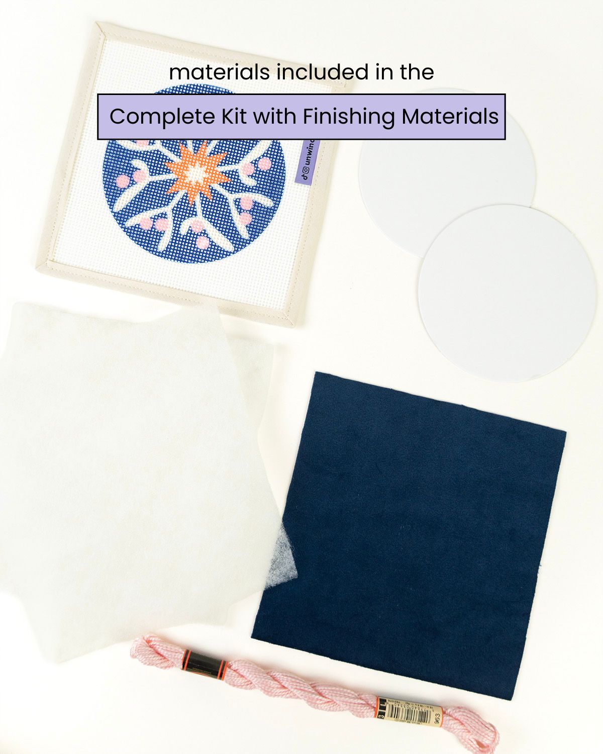 When you buy the “Printed canvas only” option, all the above is included except the threads, and just a single needle. It’s the perfect option if you want to create your own color variation, or re-use threads and yarn you might have at home!